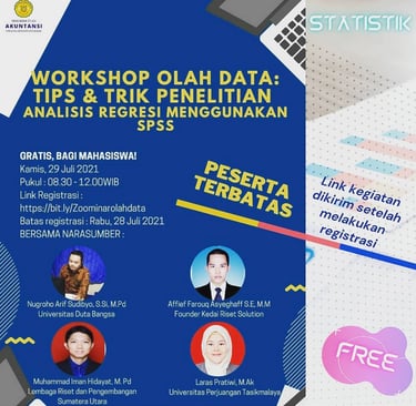 Analisis regresi bertujuan untuk mengetahui variabel-variabel kunci yang memiliki pengaruh terhadap suatu variabel bergantung, pemodelan, serta pendugaan (estimation) atau peramalan (forecasting). Karena memiliki banyak manfaat, analisis regresi digunakan hampir pada semua bidang kehidupan, baik dalam bidang ekonomi, industri dan ketenagakerjaan, sejarah, pemerintahan, ilmu lingkungan, dan lain sebagainya. Sebagai narasumber terakhir menjelaskan secara praktek cara melakukan analisis regresi dengan menggunakan SPSS. Sebelum workshop ditutup, kegiatan sesi tanya jawab berlangsung sangat aktif terutama pada uji asumsi klasik serta penggunaan statistik parametrik dan statistik non parametrik.