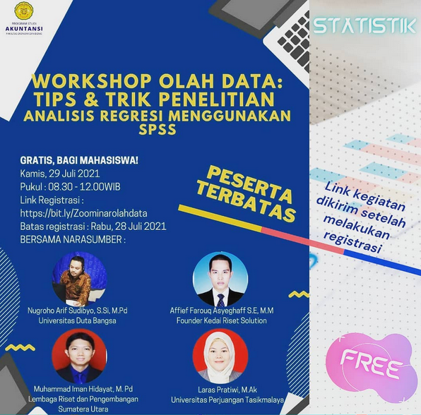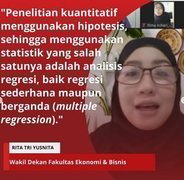 Universitas Perjuangan Tasikmalaya - Jawa Barat mengundang LRPSU sebagai Narasumber pada kegiatan workshop riset (penelitian) khusus menggunakan analisis regresi dilakukan pada Kamis, 29 Juli 2021. Kegiatan ini diikuti peserta yang berasal dari dosen dan mahasiswa dari berbagai Perguruan Tinggi. Kegiatan yang dibuka oleh Wakil Dekan I Fakultas Ekonomi dan Bisnis menjelaskan pentingnya memahami analisis regresi pada penelitian kuantitatif. Perwakilan LRPSU sebagai narasumber memaparkan mengenai hakekat penelitian/riset, desain riset, uji asumsi klasik dan prinsip melakukan analisis regresi.