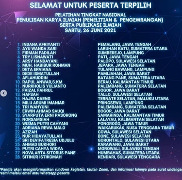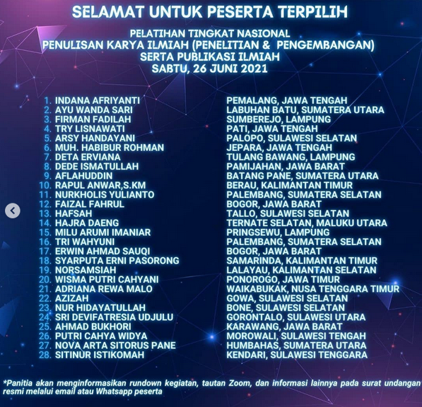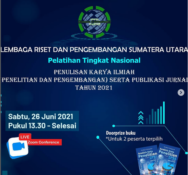 Kegiatan "Pelatihan Tingkat Nasional Penulisan Karya Ilmiah (Penelitian dan Pengembangan) Serta Publikasi Ilmiah" dilaksanakan oleh LRPSU pada Sabtu, 26 Juni 2021 Pkl. 13:30 WIB. Peserta terpilih merupakan hasil seleksi yang dilakukan panitia kegiatan LRPSU berdasarkan persyaratan yang telah ditetapkan sebelumnya. Peserta berasal dari berbagai institusi perguruan tinggi di Indonesia seperti IAIN Pekalongan, Universitas Lampung, Universitas Pamulang, STIKES Surya Global Yogyakarta, Universitas Jambi, dan lainnya. Kegiatan terbagi menjadi dua sesi. Informasi detil berupa rundown kegiatan, tautan zoom dan lainnya terdapat pada surat undangan yang dikirim melalui email dan WhatsApp peserta.